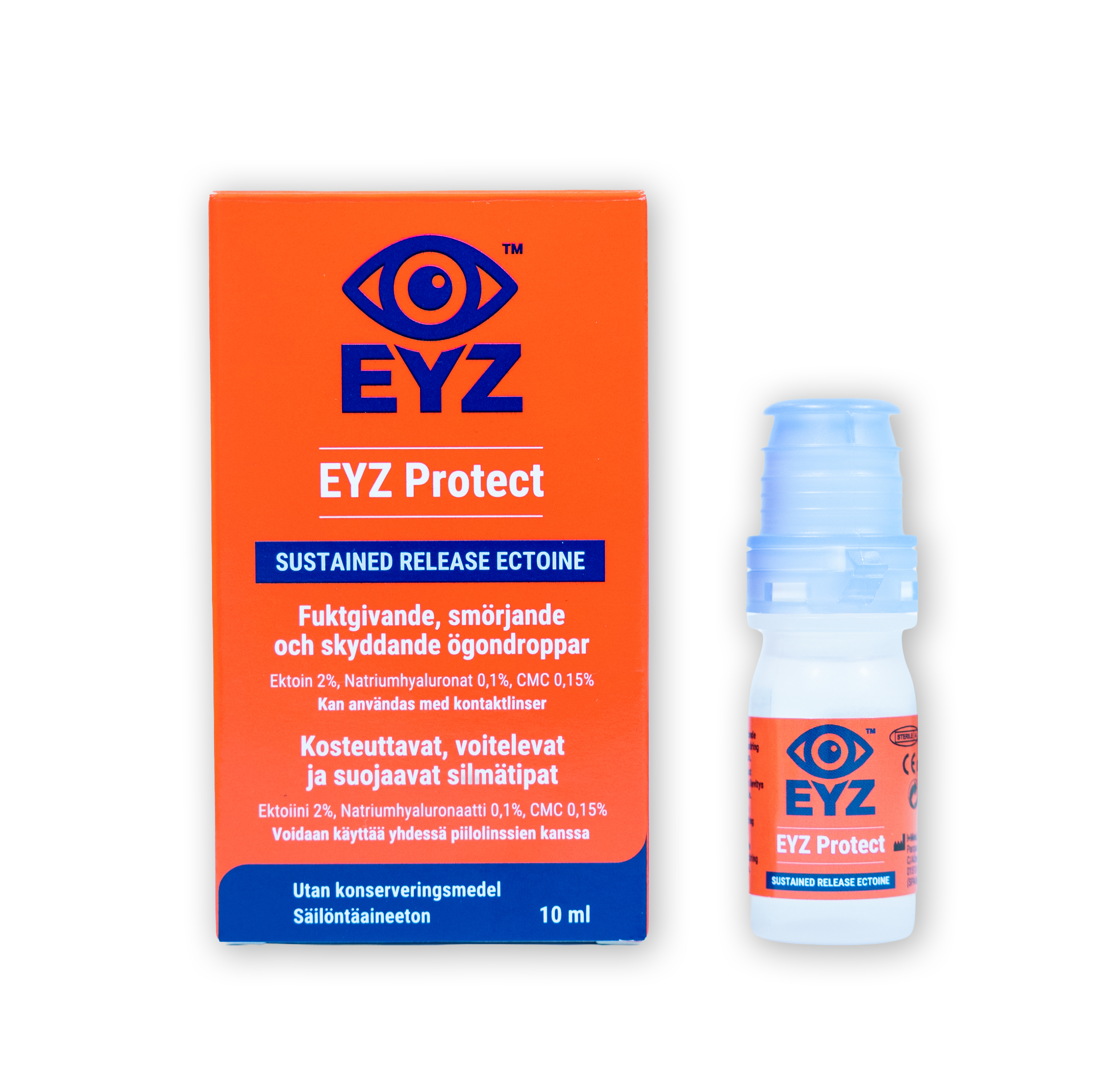 EYZ Protect er intensivt trippelvirkende øyedråper med ektoin. Hjelper tørre og irriterte øyne og lindrer symptomer ved allergi og inflammasjoner. Anbefales også ved lipidmangel. Den unike sustained release-formulaen i EYZ Protect gjør at man kan dryppe sjeldnere med lengre effekt av hver dråpe.
