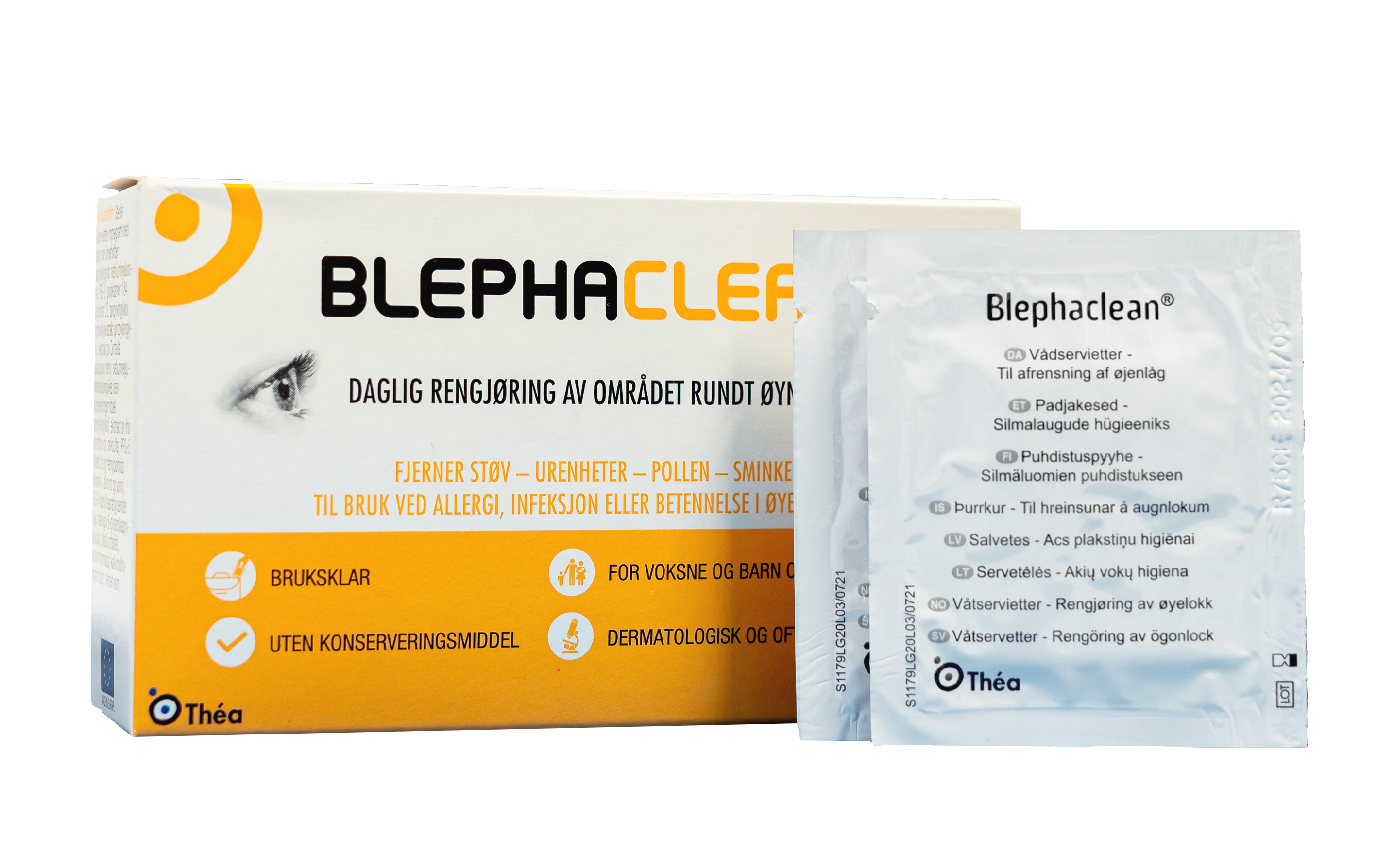 Beskrivelse Blephaclean er spesielt utviklet for sarte øyelokk og området rundt. Fjerner støv, pollen, make up, brukes ved allergi, infeksjon eller inflammasjon. For bruk før og etter operasjon i overenstemmelse med øyelegens anbefaling. |